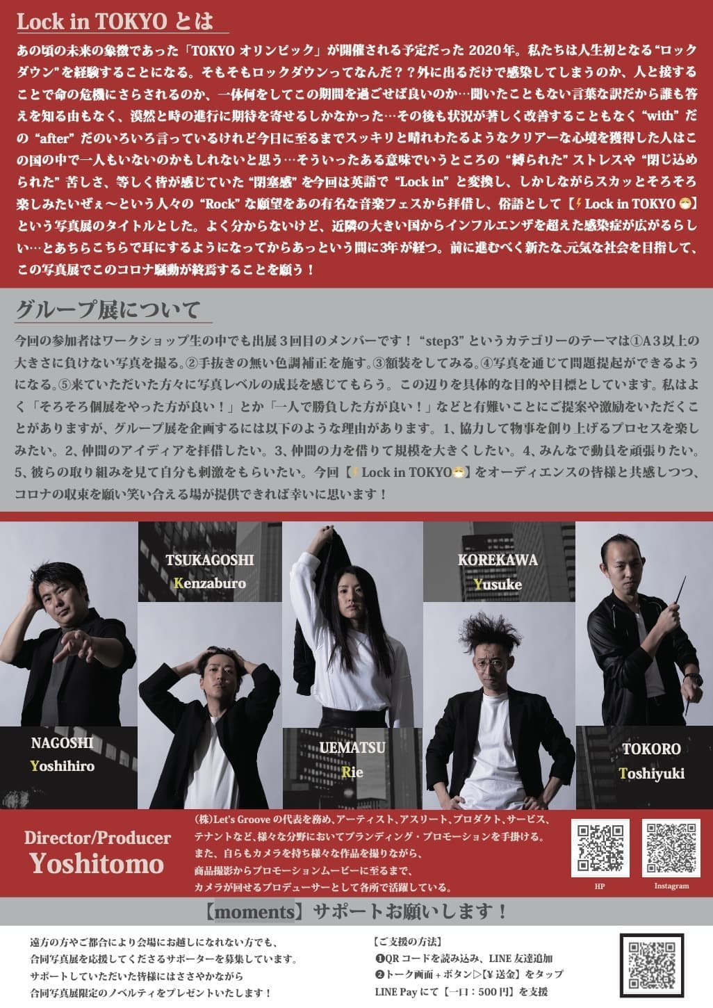 そういったある意味でいうところの“縛られた“ストレスや“閉じ込められた”苦しさ、等しく皆が感じていた“閉塞感”を今回は英語で”Lock in”と変換し、しかしながらスカッとそろそろ楽しみたいぜぇ~という人々の”Rock”な願望をあの有名な音楽フェスから拝借し、俗語として【⚡️Lock in TOKYO 😷】という写真展のタイトルとした。